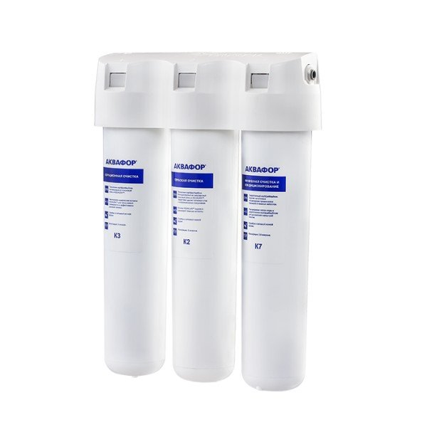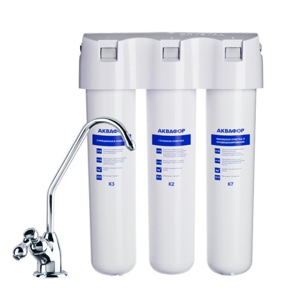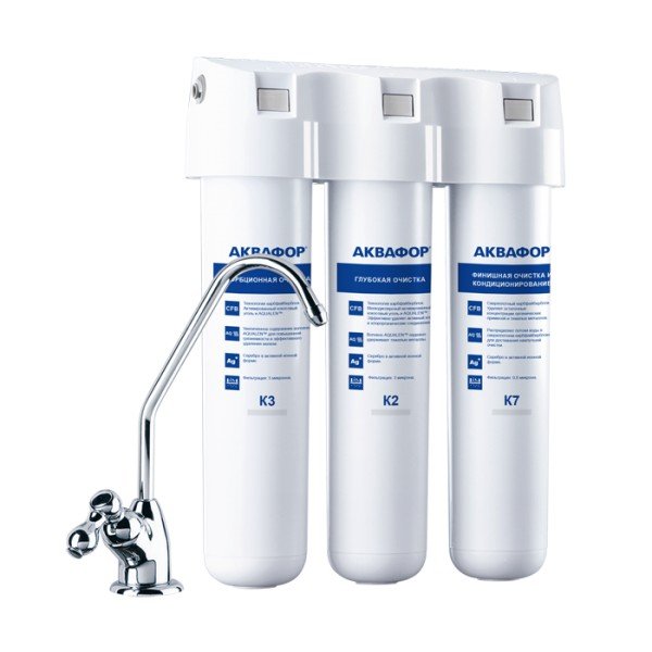Три картриджа последовательно очищают воду от видимых механических примесей и растворенных вредных веществ. Блок предварительной очистки К3 задерживает частицы размером от 5 микрон, модуль глубокой очистки К2 – от 3 микрон. Третий модуль К7 обеспечивает финишную очистку от частиц до 0,8 микрон (что в 125 раз тоньше человеческого волоса). Карбонблок с Акваленом захватывает и надежно задерживает тяжелые металлы и другие опасные примеси, которые чаще всего встречаются в водопроводной воде.